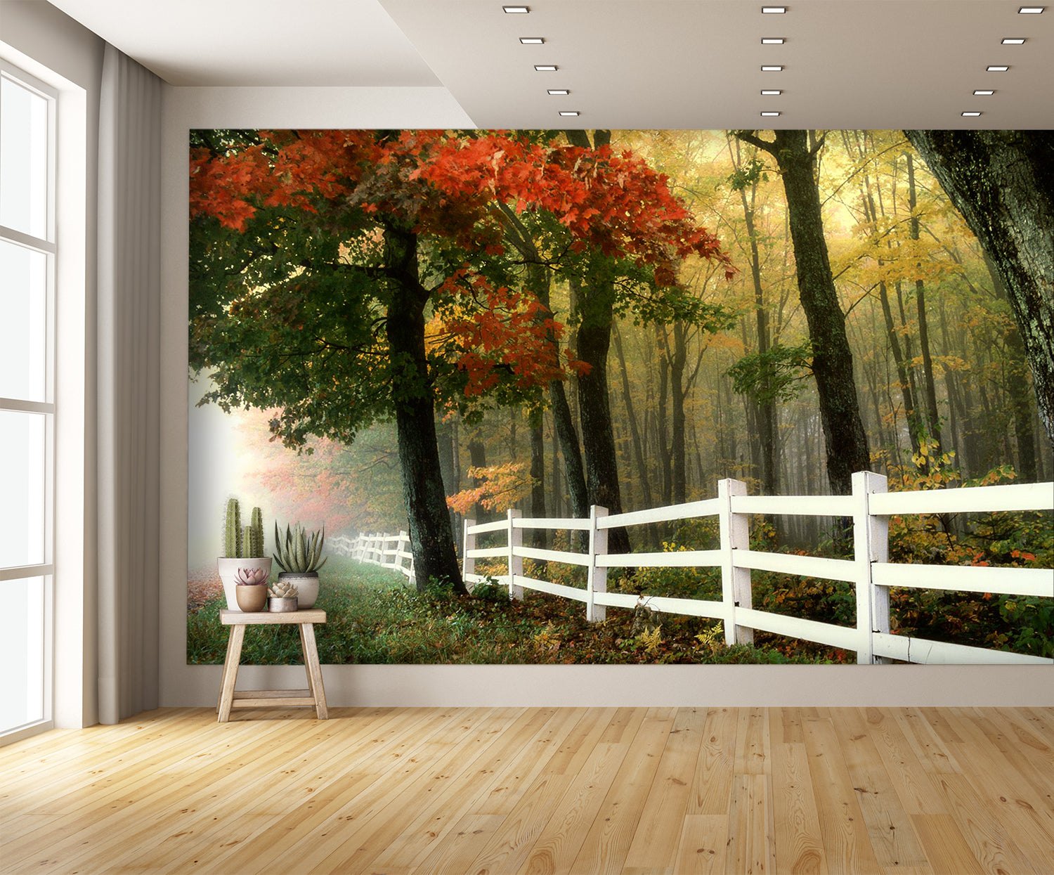 White Fence in the Fall Mural Wallpaper Peel and Stick