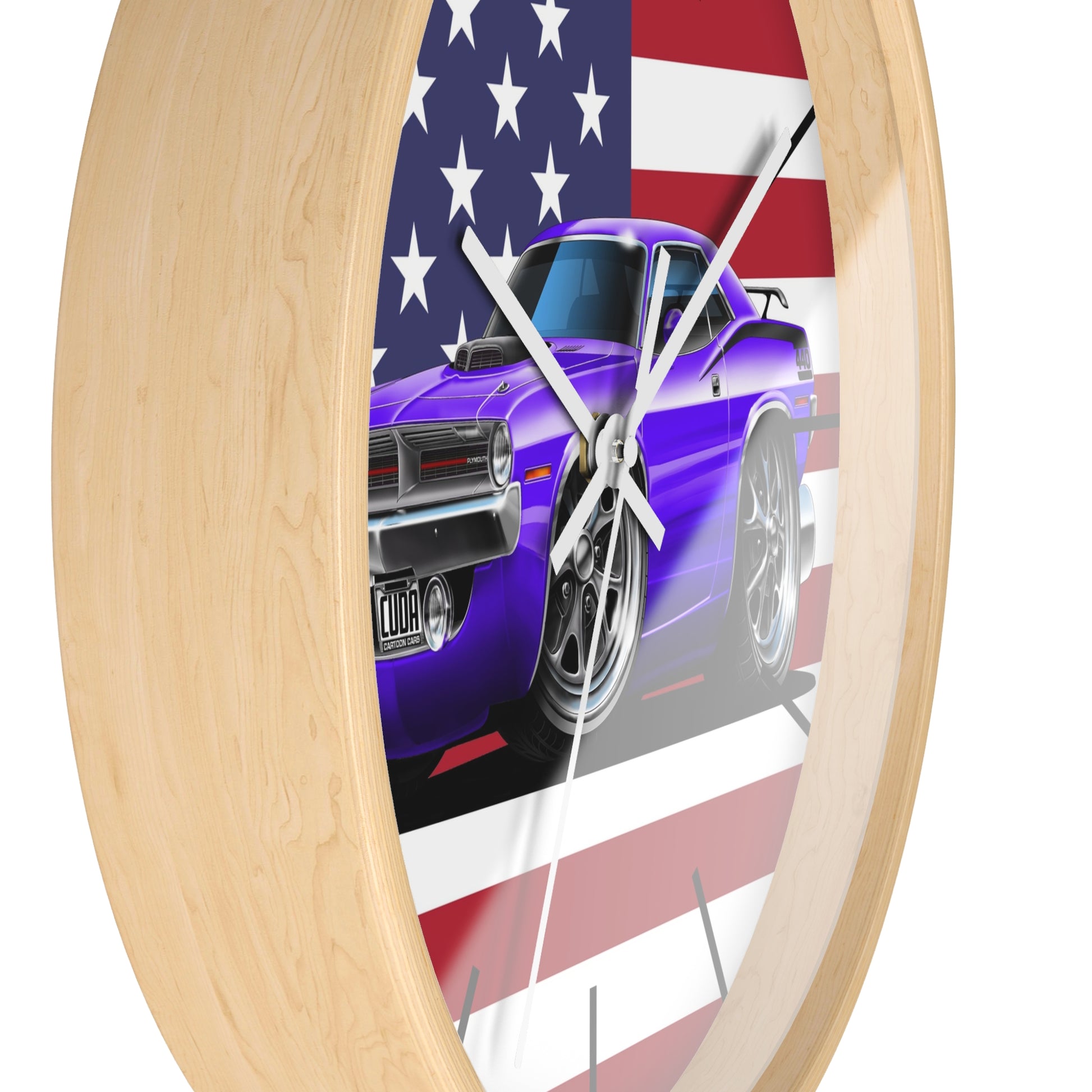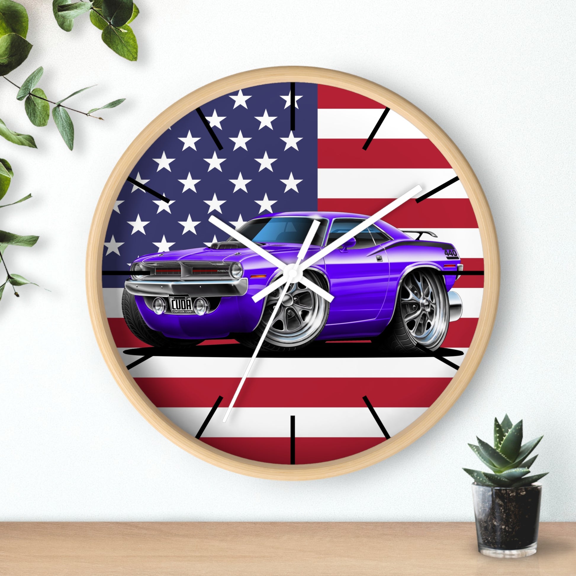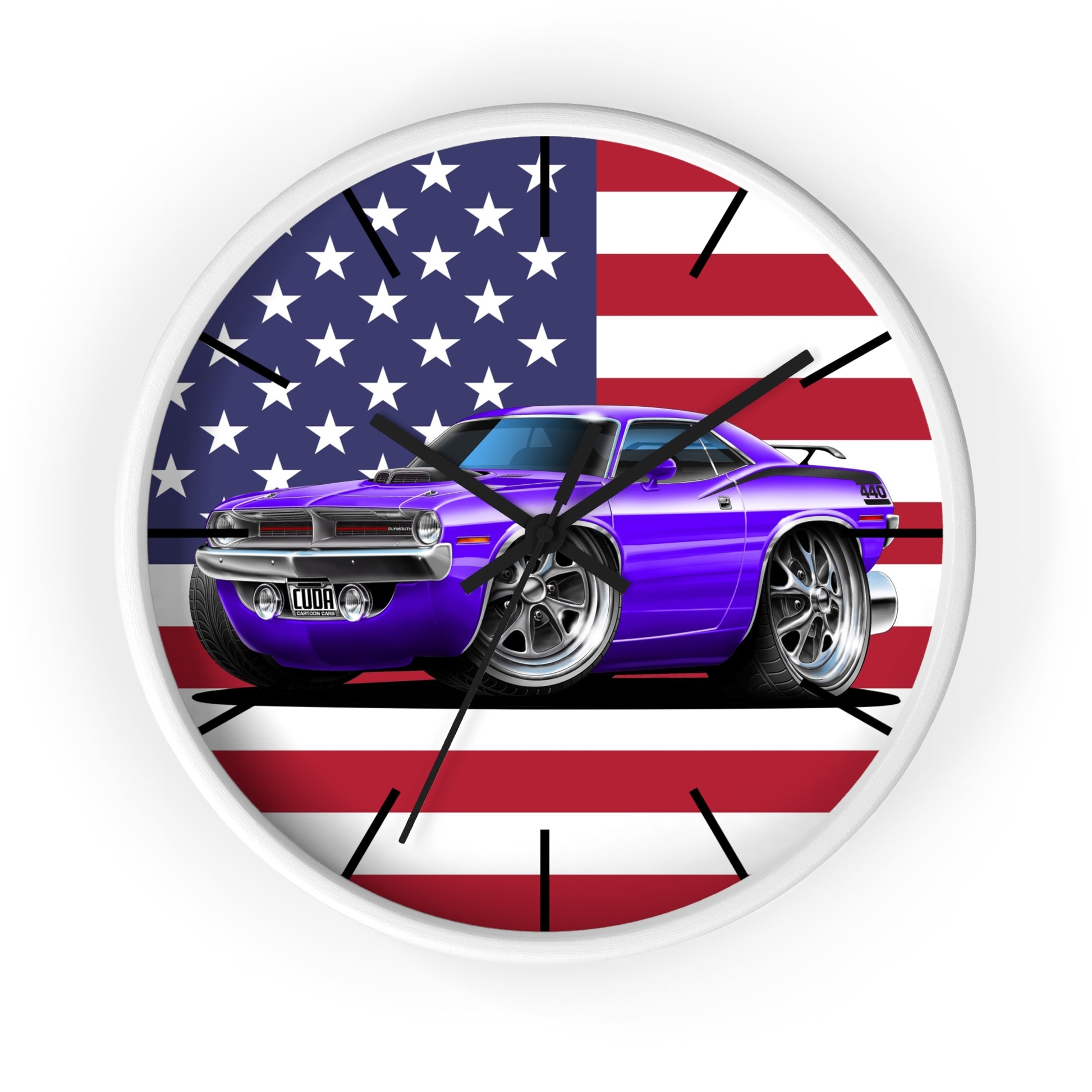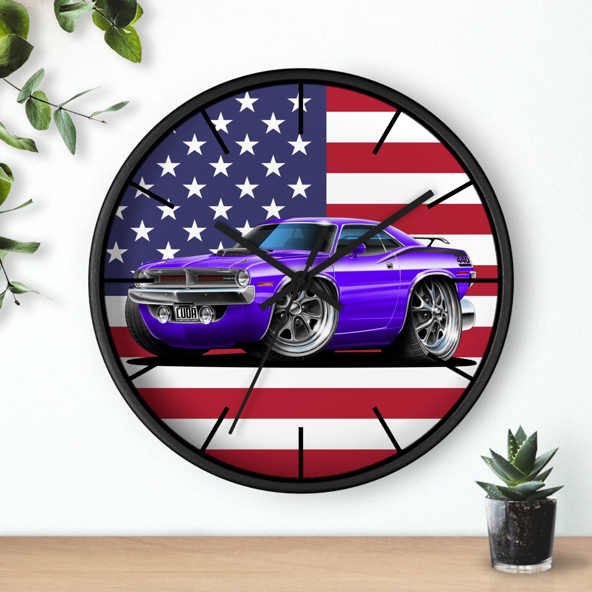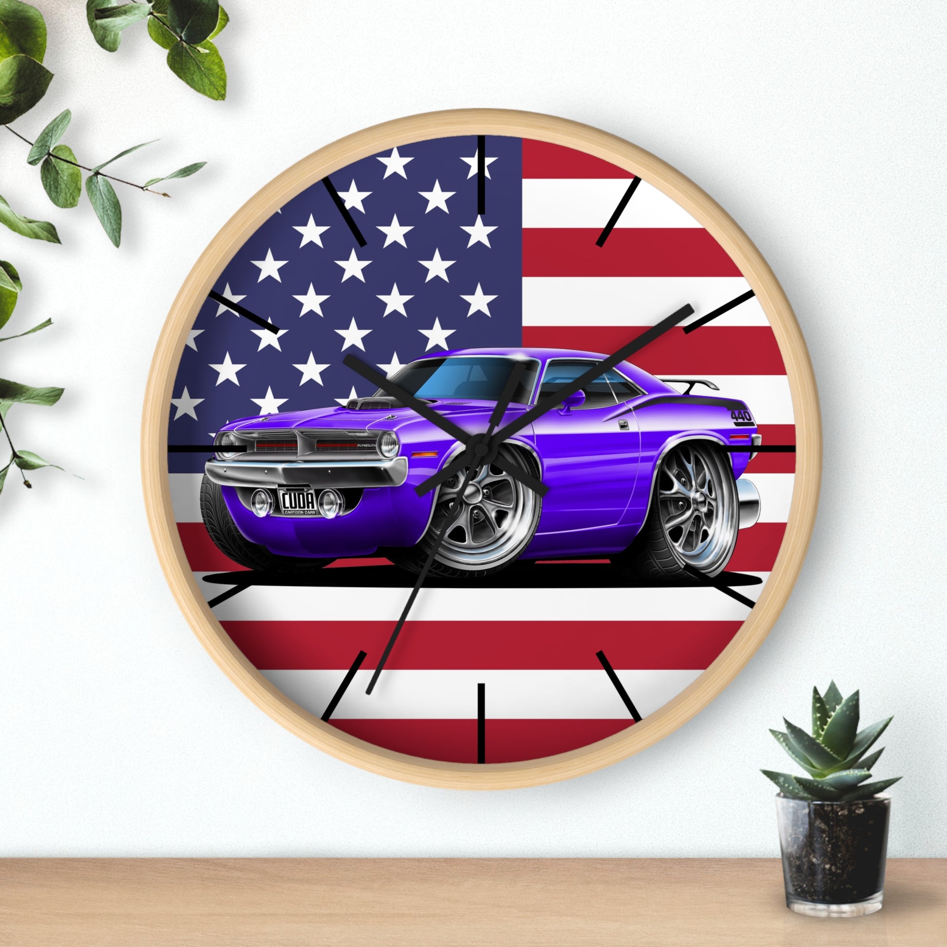 American Muscle Car Wall Clock — Purple Challenger with USA Flag