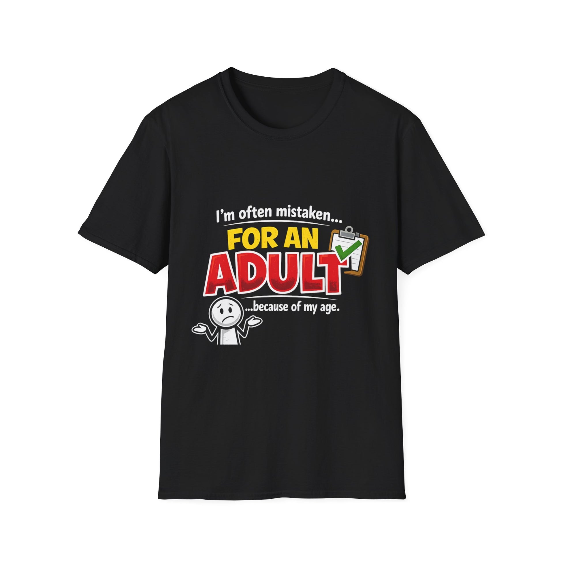 This lightweight crew neck tee carries a wry, age-aware sense of humor. Clean black cotton provides a high-contrast backdrop for bold, playful lettering and a small shrugging character that reads: “I’m often mistaken… FOR AN ADULT …because of my age.” The design sits centered on the chest so it’s easy to read in conversation or at a casual gathering. Wear it to spark laughs, start stories, and lean into dry, self-aware charm. It feels soft against the skin and holds its shape after repeated wear, so the joke stays crisp. Suitable for low-key outings, birthday get-togethers, casual work-from-home days, or evenings with friends who appreciate deadpan humor.