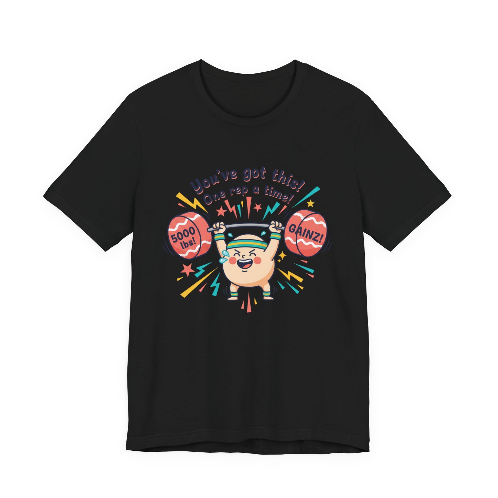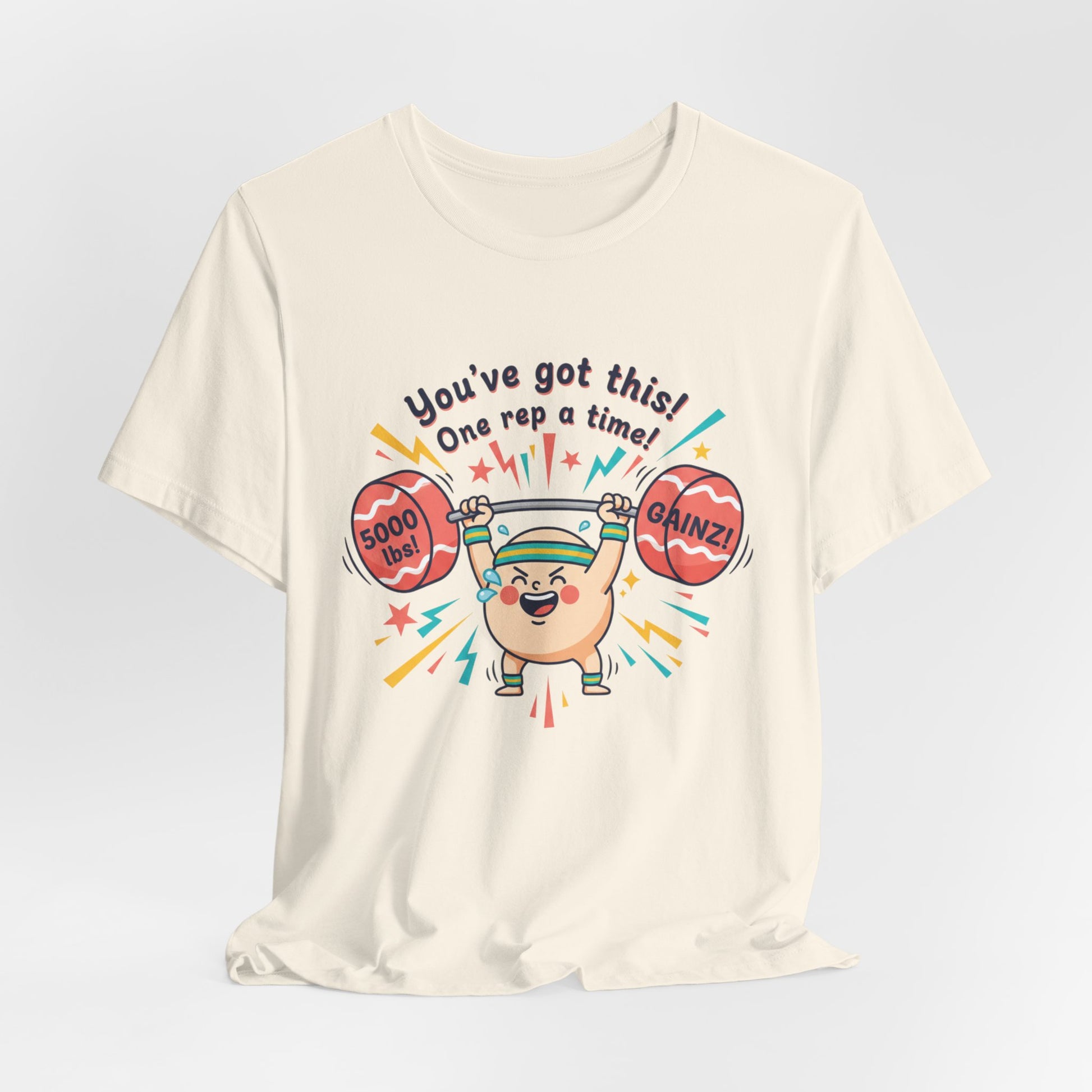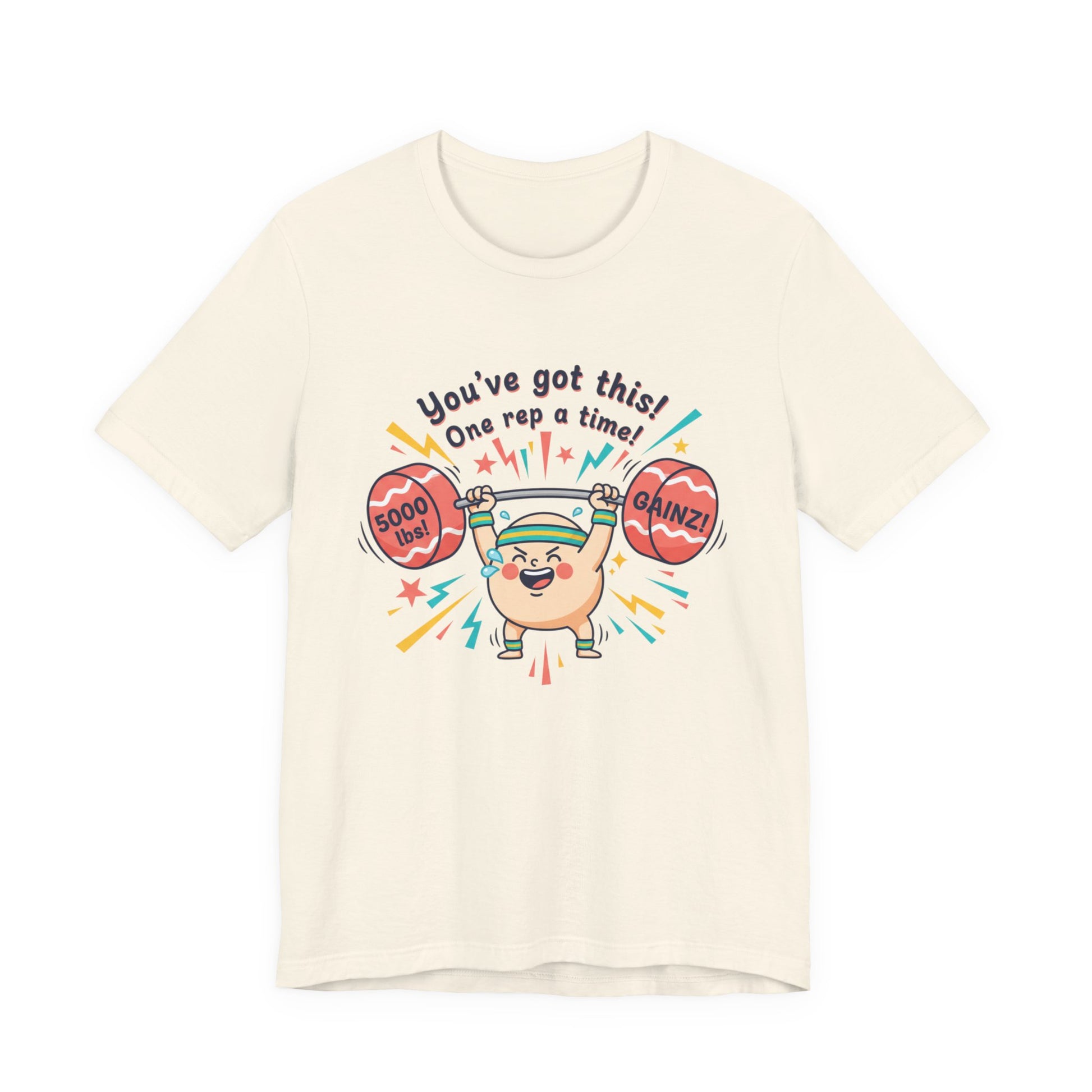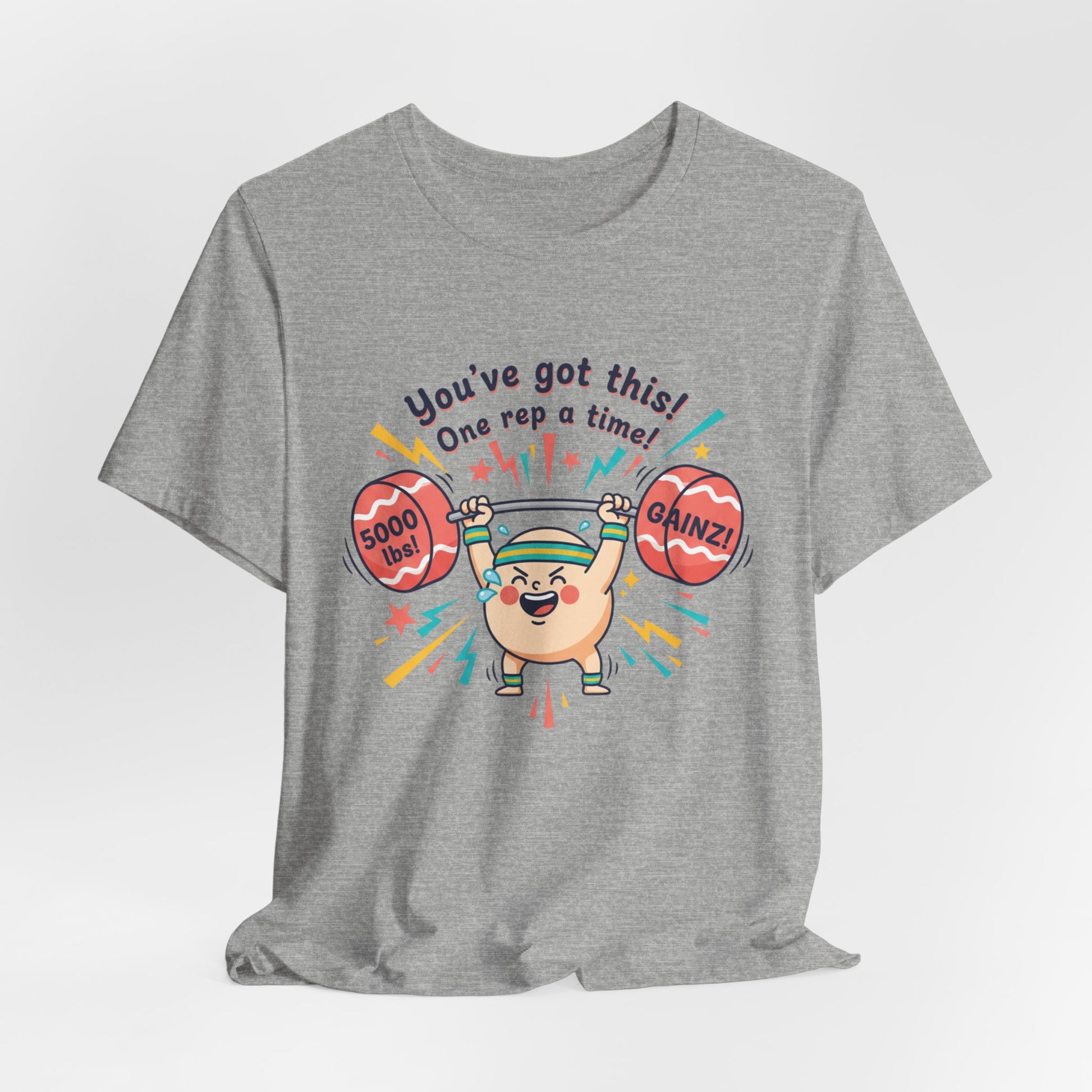 Playful, low-pressure gym humor meets cheerful encouragement: a lightweight unisex tee featuring a bright, cartoon pug lifting tiny dumbbells with the mantra “You’ve got this! One rep at a time.” The design pairs pastel bursts and simple, rounded lettering to keep the mood light and reassuring — aligned with the Gym Comeback/Gymtimidation trend that values small wins and beginner-friendly motivation. Wear it to the gym, a walk, or during warm-ups as a visible nod to showing up over perfection.